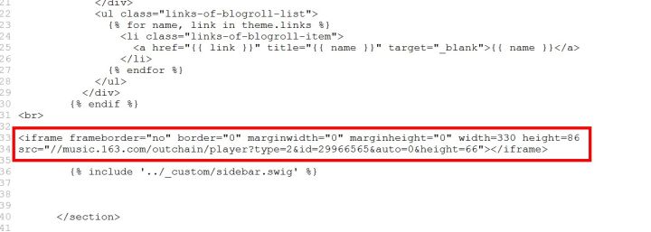比如在侧栏插入这首歌的音乐播放器,修改 blog\themes\next\layout_macro的sidebar.swig文件,添加刚刚复制的外链代码