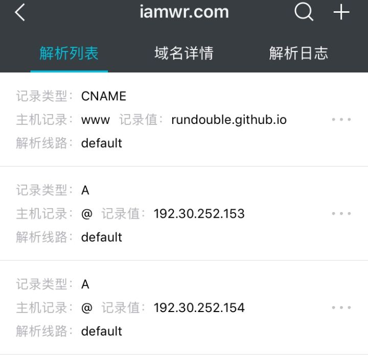 包括添加三条解析记录,192.30.252.153是GitHub的地址,你也可以ping你的 xxxx.github.io 的ip地址,填入进去。第三个记录类型是CNAME,CNAME的记录值是:你的用户名.github.io 这里千万别弄错了。第二步,登录GitHub,进入之前创建的仓库,点击settings,设置Custom domain,输入你的域名