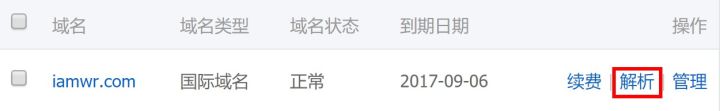 虽然在Internet上可以访问我们的网站,但是网址是GitHub提供的,比如: xxxx.github.io 而我们想使用我们自己的个性化域名,这就需要绑定我们自己的域名。这里演示的是在阿里云万网的域名绑定,在国内主流的域名代理厂商也就阿里云和腾讯云。登录到阿里云,进入管理控制台的域名列表,找到你的个性化域名,进入解析