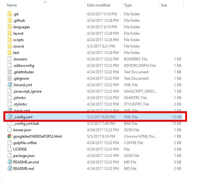 上面只是在本地预览,接下来要做的就是就是推送网站,也就是发布网站,让我们的网站可以被更多的人访问。在设置之前,需要解释一个概念,在blog根目录里的_config.yml文件称为站点配置文件,如下图