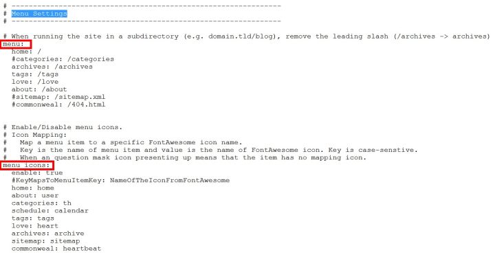 默认的侧栏菜单条目有:首页、归档、标签、关于、搜索等。如果你想要增加其他的菜单条目,修改主题配置文件_config.yml里的Menu Settings中的menu和menu_icons两个地方