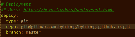 下一步将我们的Hexo与GitHub关联起来,打开站点的配置文件_config.yml,翻到最后修改为:
